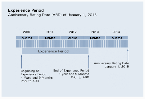 Your anniversary rating date determines the experience period and the effective date of your experience modification. In most cases, all payroll and losses developed under any policy beginning within this period will be used in determining your experience modification. The experience period begins four years and nine months prior to your anniversary rating date and terminates one year and nine months prior to the anniversary rating date. If your anniversary rating date is January 1, 2015, the experience period is April 1, 2010 to April 1, 2013.